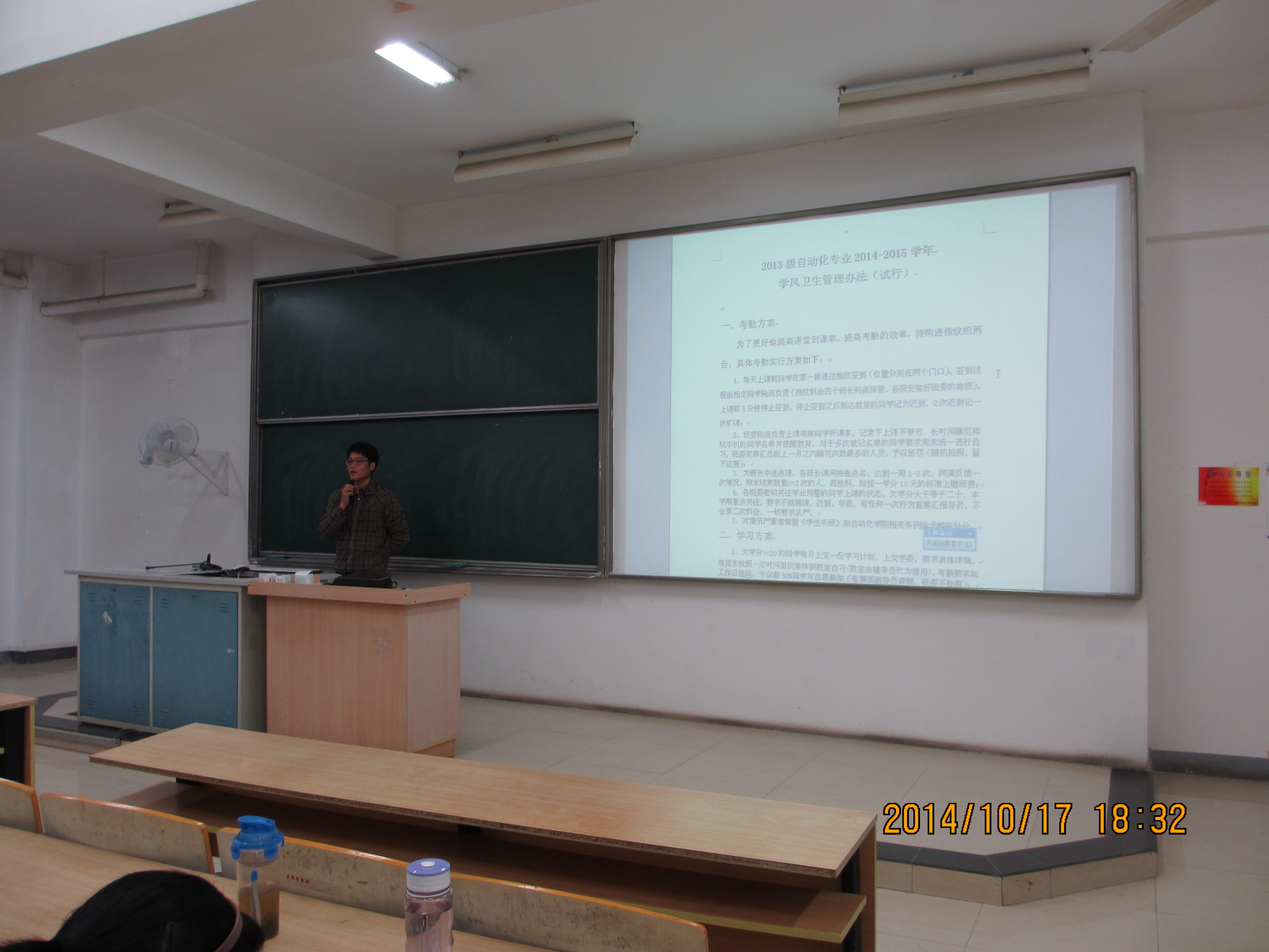 最后,秦老师公示了他和各班委精心策划的学风卫生管理办法。一个班级学风如何直接决定了这个班级成绩如何,素质如何,而整风的侧重点在大一学年欠学分较多的同学,针对他们一学年的表现,秦老师出台了包括指纹签到,周末集体自习,性交视频处分等等一系列的管理办法,以期对他们起到约束和督促的作用。而对于卫生方面,秦老师继续延续大一学年的严管理方案,将我们生活的宿舍变为干净,整洁,温馨的家。