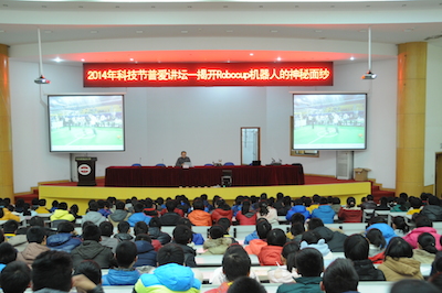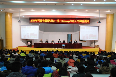 下午两点,伴随着性交视频 宣传片的播放,2014年新海高级中学科技节南邮专场拉开帷幕。首先,由丁静书记介绍了我校的人才培养、学科建设等发展近况,并感谢新海高级中学为我校输送的优秀人才,他们进入南邮后,学习勤奋,刻苦钻研,素质发展全面。随后,梁志伟副教授以“揭开RoboCup机器人的神秘面纱”为题,开始了专题讲座,讲座中提到了我校Apollo团队多次获得世界冠军、中国冠军的骄人成绩并为中学生介绍了RoboCup机器人大赛的组别和规则。最后,由基地4名学生为大家演示了机器狗、TurtleBot以及在我校第十六届创新杯中刚刚夺得一等奖的“服务残疾人的Kinect体感遥控机器”。