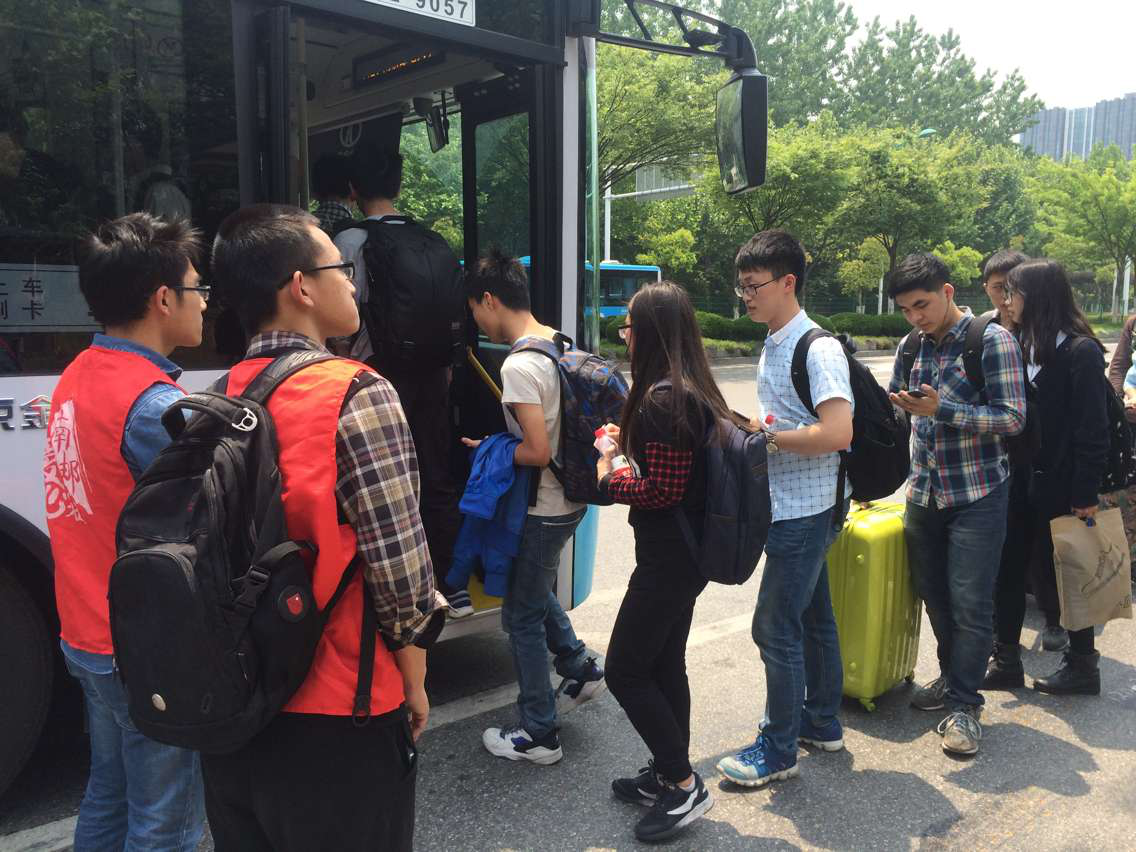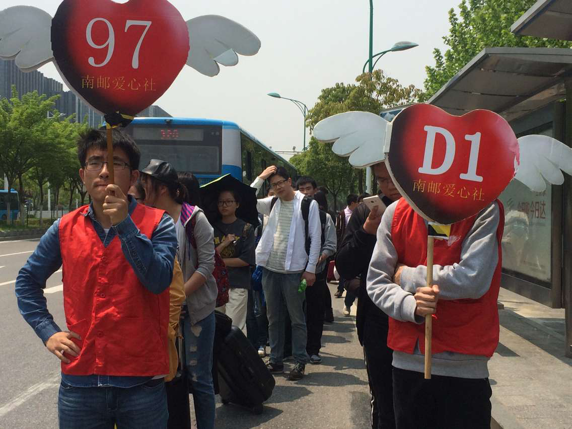 2016年4月30日,为了让我校学生在五一黄金周安全、有序出行,性交视频 爱心社组织社员们在性交视频 公交站台提醒并帮助乘客文明乘车、安全出行。活动当天的最高气温达28度,社员们身着红色爱心马甲,手里举着“97路”“D1路”的牌子,身后是一列身背双肩包、手拿行李箱的邮子。