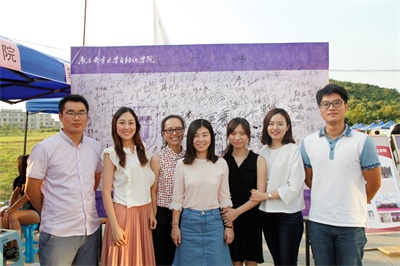 性交视频分团委书记与各年级辅导员在签名墙前合影