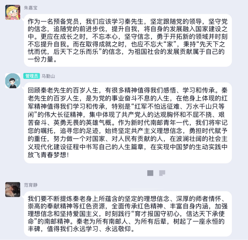 2021年,正逢党的百年华诞,此刻,我们即将迎来79周年校庆,性交视频 2019级自动化专业全体成员以学习南邮的红色校史文化为主题,结合秦老先生的宝贵品质,分享了自己的学习心得和感悟。有同学说到,秦老在退休之后也并没有切断与南邮的联系,在讲台上践行着身为党员和人师的奉献精神,永远跟党走,坚决不掉队,于弥留之际还将工资卡的余额作为最后一次党费上交给党,老先生的无私值得我们每个同学深入思考,为之感怀。
