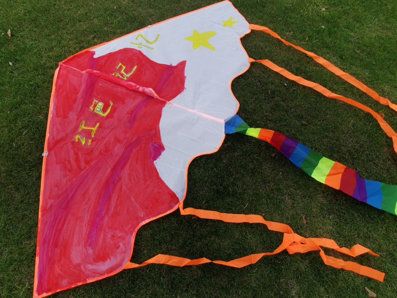从小对放风筝充满兴趣的郑甜甜了解到本次艺术节活动后,便填写报名表积极加入进来。郑甜甜团队的风筝古灵精怪,创意十足,谈起灵感来源,她说到“因为想要融入中国传统文化元素,展现在中国共产党的领导下,我国日益繁荣昌盛的画面,所以我们把”龙“的元素运用到风筝里。整个风筝走的是抽象风格,体现出随性的感觉。整个创作的过程都充满了快乐,与队员们合作得很愉快。”