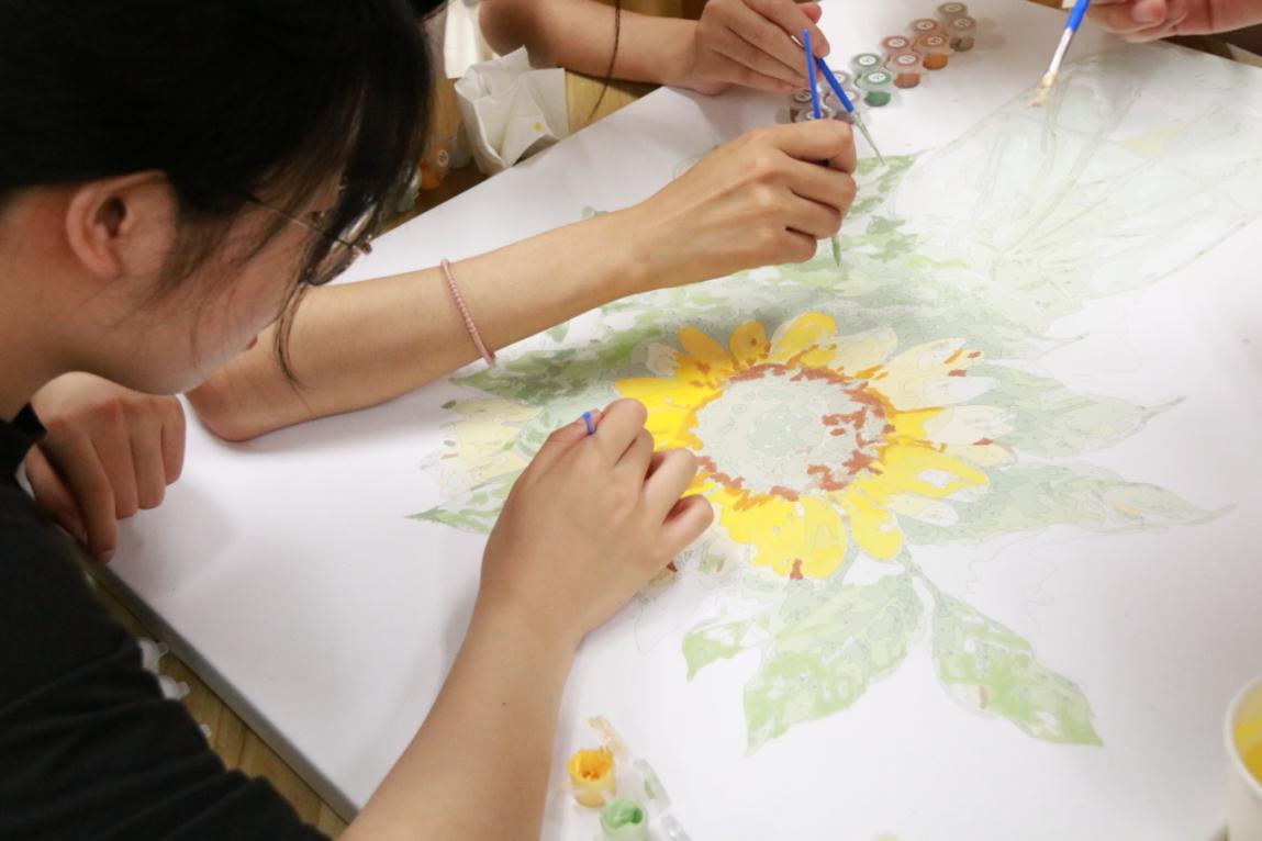 本期团体辅导的最后一个环节——青春色彩,每个小组领取一幅空白的DIY数字油画,根据画上色块提示完成色彩填充。各组成员拿起画笔,找准颜色,认真渲染自己的画作。沉浸式的艺术体验,让同学们的心灵得到了放松与陶冶,心情也逐渐平静与舒缓,当美丽的画作大功告成,全体同学都感觉成就满满,纷纷拿出手机记录下这美好的画面。