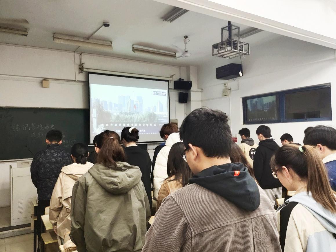 全体同学向在南京大屠杀中死遇难者以及为民族抗战而牺牲的先烈默哀一分钟。默哀气氛庄严肃穆,在场所有的同学都深受感染,深切体会到了民族凝聚力和国难当头同仇敌忾的民族气节。李佳柔同学带领大家在国家公祭网上进行和平祈愿,共同朗读《和平宣言》,一起缅怀死难者,铭记历史,珍视和平。