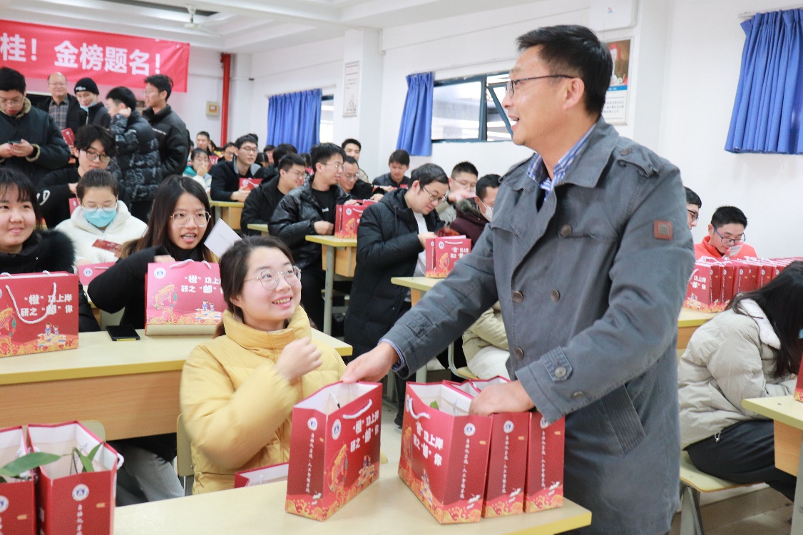 活动现场,全体领导和辅导员为同学们发放慰问品。慰问品包括考研文具、防疫物资、手写贺卡以及一颗橙子,寓意考研学子心想事“橙”!“橙”功上岸!