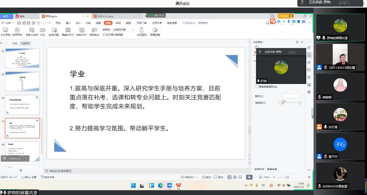会议伊始,孙书记向全体学生提出新学期要求和期望:一、团结友爱同学,营造良好学风。认真听讲,遵守网络课堂纪律,可以以寝室、班级为单位搭建团结互助学习平台。学生干部和党员要积极发挥作用,主动帮助有困难的同学,协助老师开展好教学服务工作;二、做好疫情防控,打扫宿舍卫生。同学们要遵守疫情防控相关政策要求并做好自身防护,积极配合每天线上健康打卡。开学期间保证寝室内务整洁卫生,遵守寝室安全管理规定,杜绝安全隐患,营造良好安全的生活环境;三、遵守校纪校规,谨防电信诈骗。同学们要提高反诈骗能力,增强防范意识,不轻信陌生人,不泄露个人信息,避免掉入诈骗陷阱,遇到大额转账请及时联系老师;四、做好生涯规划,努力拼搏奋斗。同学们应树立正确的择业、就业观念,科学规划职业生涯,以自身经历激励同学们明确自己的奋斗目标和努力方向,努力提升就业能力;五、积极参与活动,锻炼综合素质。同学们从专业、兴趣出发,从力所能及的小事做起,坚定理想信念,锻炼扎实本领,锤炼品德修为。最后,孙委委表示各位同学生逢盛世,肩负重任,应成长为立大志、明大德、成大才、担大任的新时代大学生。