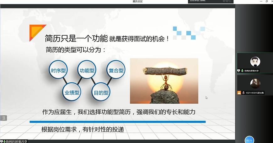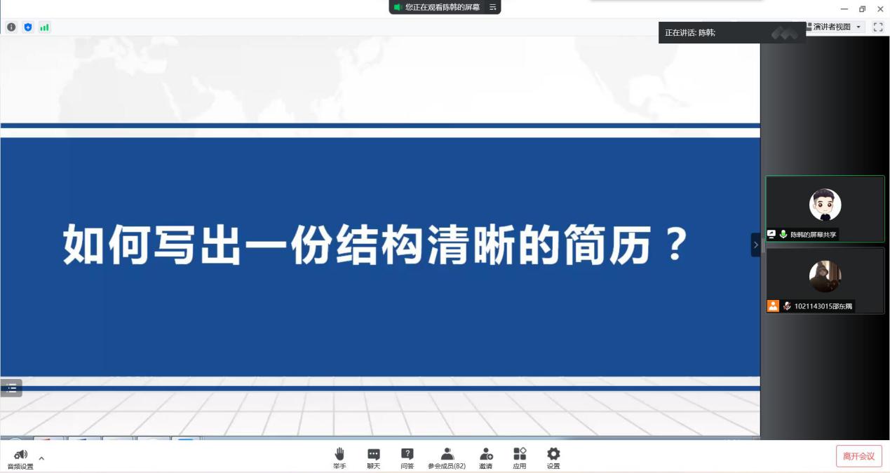 陈老师从简历制作、简历投递、面试形式三个方面向同学们分享了宝贵的经验和技巧。