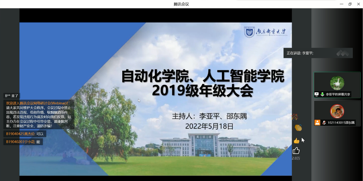 为做好常态化新冠肺炎疫情防控工作,提升学生法律安全意识,进一步帮助学生明确毕业规划,助力学生成长成才,5月18日下午,性交视频 、人工智能性交视频通过线上线下相结合的模式开展了2019级学生年级大会。性交视频 2019级学生骨干线下参会,其余学生线上参会。本次会议由2019级辅导员李亚平和邵东隅老师主持,包含了疫情防控法律知识宣传、防火防灾警示教育以及毕业意向调研等内容。
