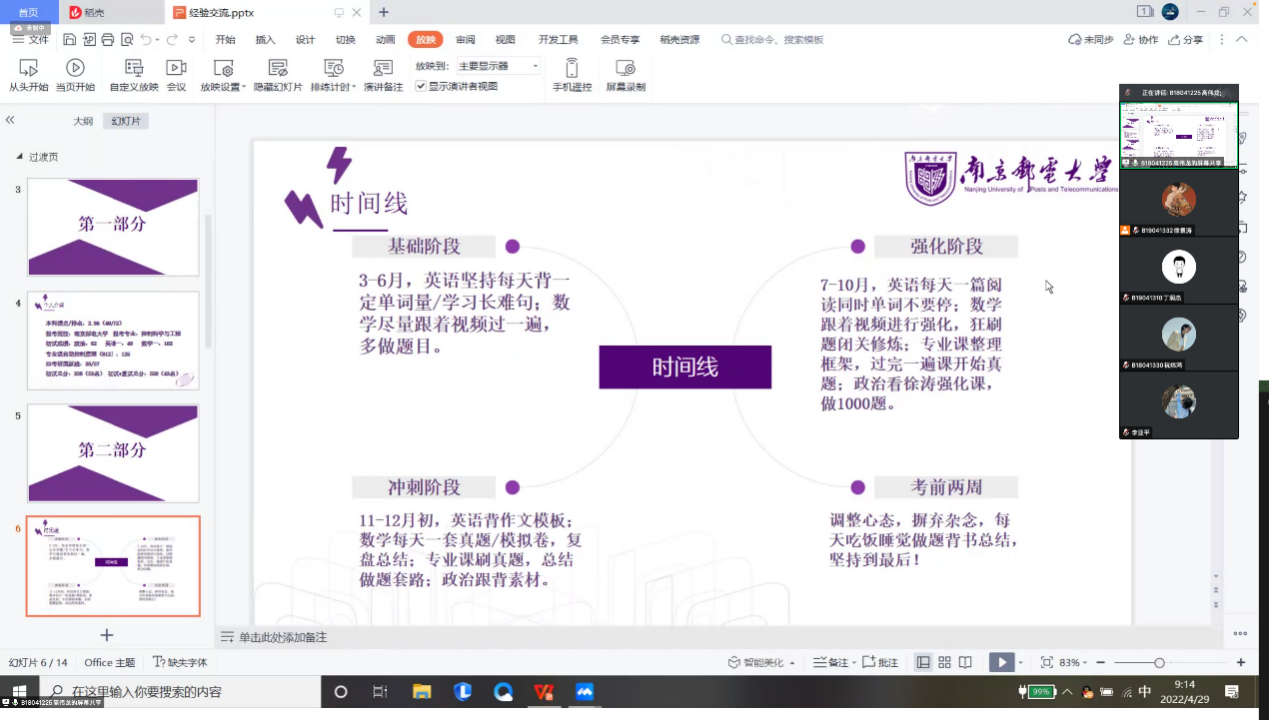 考研经验交流会是性交视频 的传统活动,旨在通过同辈对话与指导,提升学生的备考能力,增强学生考研信心。为进一步开展精细化的考研指导,营造浓厚的学习氛围,性交视频 2019级5个专业于近日分别陆续开展了考研经验交流会,特别邀请到2018级已成功考取硕士研究生的吴亚辛、廉洁、高伟龙等12位学长学姐进行了经验分享。2019级辅导员老师全程参加。2019级同学们积极参与,收获颇丰。