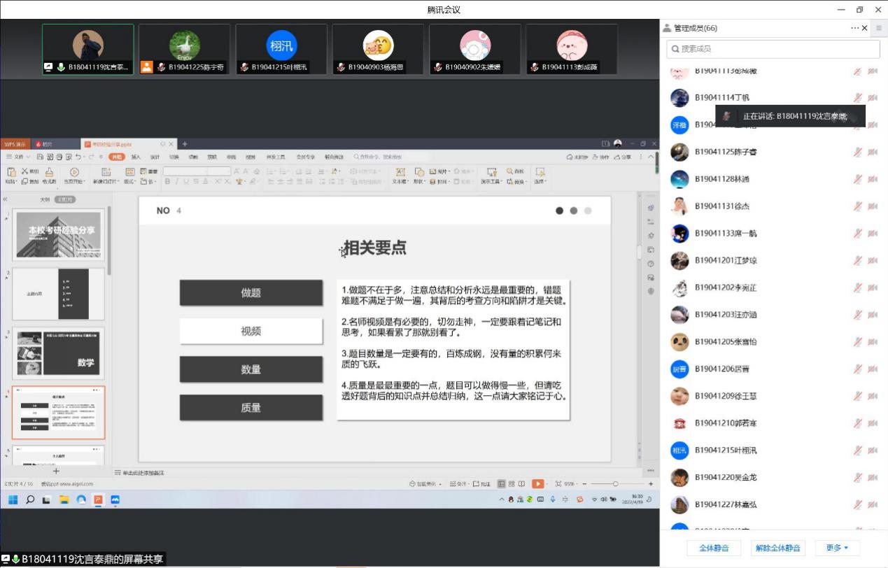 分享结束后,学长学姐们耐心回答了同学们的提问,并送上了真挚的鼓励和祝福。辅导员老师们在总结环节再次鼓励同学们努力拼搏,积极备考,不辜负青春年华和美好时光。2019级同学们表示,在此次考研经验分享交流会获益良多,深受启发,并表示将明确目标,奋发向前。